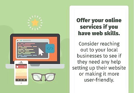 Offer your online services if you have web skills. Since so many businesses are switching to an online platform, the need for web designers has grown a ton. If you have the skills, consider reaching out to your local businesses to see if they need any help setting up their website or making it more user-friendly. If you are a writer or a photographer, businesses may also need your help with creating content for their website. Online notary services and financial help are also needed in some communities. If you have legal skills, Lawyers for a Good Government is rolling out an online program nationwide where you can help those in need virtually.