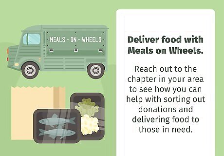 Deliver food with Meals on Wheels. This organization provides food to those who cannot leave their homes. Reach out to the chapter in your area to see how you can help with sorting out donations and delivering food to those in need. To sign up as a volunteer for Meals on Wheels, visit https://meals-on-wheels.com/volunteer/.