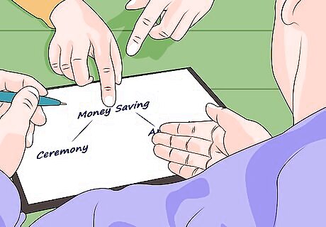 Start saving as soon as possible. If you want to help your child pay for their future wedding, the easiest way to ensure that you have enough money is to begin saving as soon as possible. Once you have the resources, start putting away a little bit of money for your child’s wedding. Talk with your partner about opening a savings account and putting small amounts of money in it to pay for any future weddings. There are a number of different types of savings accounts that you can consider. Check with your local bank or financial institution. Make sure that you are saving equitably for all of your children. Financially favoring one child over another can lead to resentment and animosity in your family.