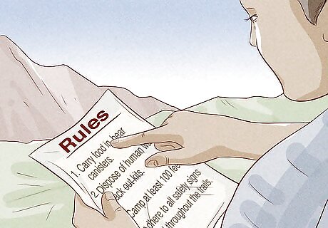 Follow the trail safety guidelines and rules. As a protected area, there are several safety guidelines and rules that all hikers must follow. When you are hiking Mount Whitney, you need to be aware of these guidelines and following them accordingly. A few important safety guidelines and rules are as follows: Hikers are required to carry food in bear canisters from Memorial Day to November 1. All hikers on all trails are required to dispose of human waste in pack out kits or waste bags. Overnight hikers must camp at least 100 feet away from any streams or lakes, as well as the trail. Hikers must adhere to all safety signs posted throughout the trails.