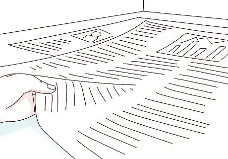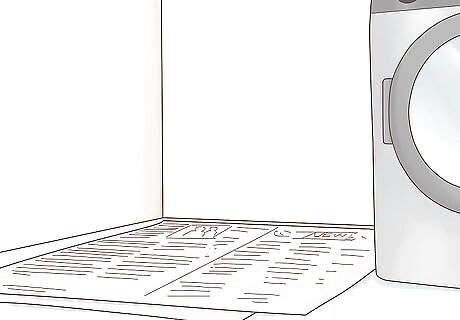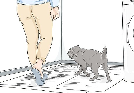 Line the designated spot with newspaper or training pads. A newspaper is a cheap material you can use to create a bathroom mat for your dog. Absorbent training pads are also available in pet stores. Choose the option that's most convenient for your household. Note: Be aware that your dog may get used to only relieving themself on a newspaper if that's all that you put down. You could also use a dog litter tray. If you'll also take your dog outside to relieve themself, consider filling the tray with soil. This way, the dog will learn that it's acceptable to relieve themself outdoors and indoors.