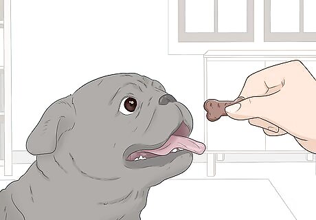 Reward your dog for going in the spot. Each time they successfully go on the mat, reward them with a treat, petting, and praise. They’ll eventually come to associate going to the bathroom on the mat with positive feelings, and they’ll start going there without your help before too long.