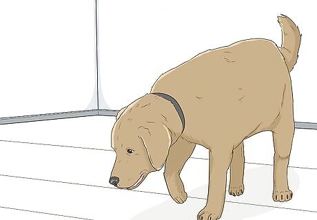 Keep your dog in a crate at night and when you're away. If you leave your dog or puppy free to roam the house at night, they are sure to end up soiling the floor. Keeping them in a cozy crate at night and when you're gone reduces the chance that they’ll make a mess. Dogs don't like to soil their dens, so your dog will try to wait until they can go outside to relieve themself.Note: Dogs should see their crates as safe spaces and enjoy spending time there. Keeping your dog in a crate is not meant to be a form of punishment. Never punish your dog by banishing them to the crate, or they’ll come to associate it with fear instead of comfort. Do not let your dog stay in their crate for too long before taking them outside. If you wait too long, they’ll have no choice but to relieve themself in the crate. Dogs need plenty of exercise and playtime too, so you should never leave them crated for more than a few hours at a time or overnight.