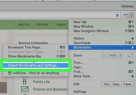 Click the Menu button/triple-beam bar icon that appears next to the Chrome extensions you have near the top right corner of the browser and select the "Bookmarks" option then click the "Import bookmarks and settings" option that displays in the drop-down menu.