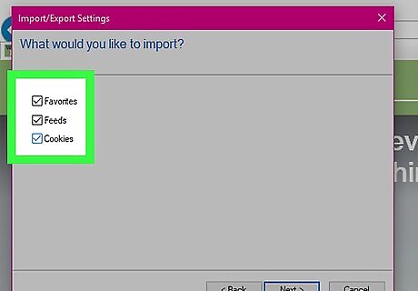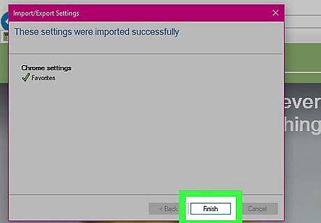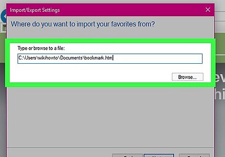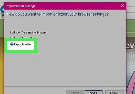 Export your bookmarks to other browsers, if you've chosen to Export them. Click the "Export to a file" option then Next button to continue. Make sure that "Favorites" box is checked and click "Next" then select the folder of bookmarks/favorites you'd like to export and click "Next". Watch the location it will save the HTML file to; by default it saves your file in your personal Documents folder then click the "Export" button.