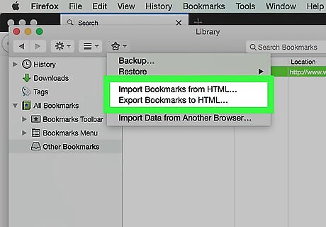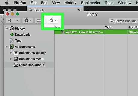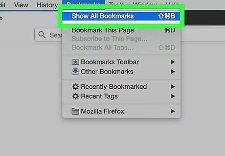 Open the Show All Bookmarks menu, from the newest versions of Firefox. (On older versions, you'll have to select the Bookmarks" option from the bookmarks section of the toolbar.) Click the toolbar option at the top right corner of the screen that looks like a clipboard with a piece of lined paper on it, and select "Show all bookmarks".Import and Export Bookmarks Step 12 Version 3.jpg