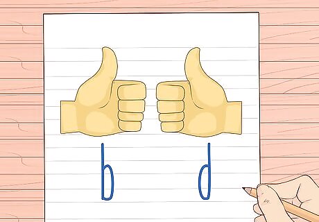 Help your child distinguish similar letters. Some letters are commonly confused or put backward. For instance, the lowercase "b" and "d" are often confused. One way to help your child is to tell them to "make their bed" by making two thumbs up symbols and bumping them together, forming a "bed." The left side looks like a lowercase "b" and the right side looks like a lowercase "d." Another commonly confused pair is Ws and Ms. One trick you can use is to mix up a bunch of Ms and Ws on a page and have your child circle all the Ms or all the Ws.