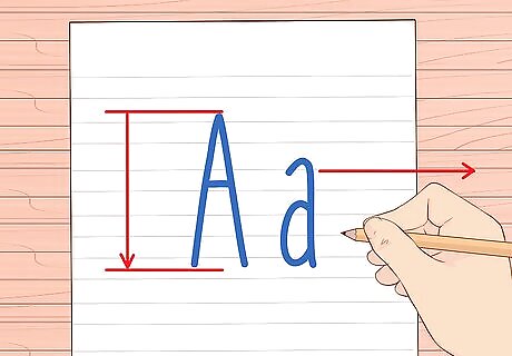 Show him/her how to work within the lines. Lines can help her get her proportion correct, which in turn makes her handwriting more readable. If she's having trouble with it, show her the best way to do it. Use primary handwriting sheets that have colored lines as guides for each letter. Capital letters should go from the top line to the bottom line, and they should be twice the size of a lowercase letter. Also, help her make sure her letters don't float or sink by always positioning the bottom of the letter (with the exception of tails) on the line. One way to help her get this right is to highlight the bottom half of the space. Tell her the small letters need to stay within the color and that only capital letters can extend above it.