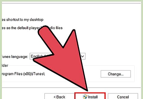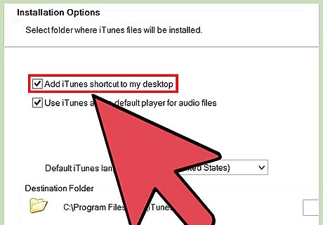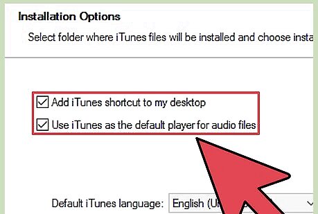 Modify your preferences on the “Installation Options” screen. You will have the option to add an iTunes shortcut to your desktop, use iTunes as your default audio player, and choose the location on your computer at which you want iTunes stored.