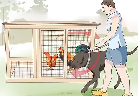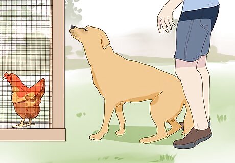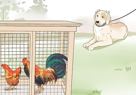 Take your dog with you while you do chicken coop chores. While you are doing the chicken coop chores, take your dog with you. It is best to start while your dog is a puppy. Your dog will gradually get used to being around you and the chickens. If you need both hands, you can tie up your dog away from the chicken coop. While you are doing your chores, keep an eye on your dog’s body language. If your dog shows any signs of aggression such as barking, take them out of the coop and try again another time.