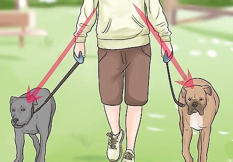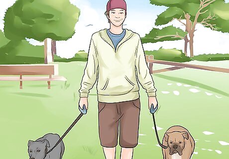 Start taking the dogs on walks together. As the two dogs get used to one another, stretch out the 20 minute segments by taking them for walks together. When going for walks, always put on the established dog's leash first. Let him through the door ahead of the newcomer. He is less likely to challenge the newcomer if he is assured that he is top dog.