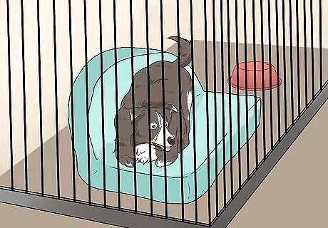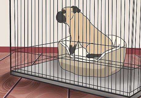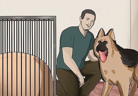 Show the crate to the new dog. Bring the dog to his crate and place him inside. Leave the door open so that he can come out if he wants to.