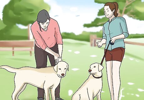 Allow the dogs to meet. Set off on a walk in the park as if it’s just a normal walk. Allow the dogs to meet up. Meeting on neutral territory lowers the stakes because neither dog has anything to defend there. Monitor the dogs' body language closely. Only go through with the meeting if all parties are calm and not showing any signs of aggression. Let the dogs circle around to sniff each others' rear ends rather than forcing them to meet face-to-face (which is an unnatural, "impolite" greeting in the dog world). Ideally, the dogs will meet in this type of situation a couple of times before the newcomer arrives at your home. If the two dogs get along and play well together in the park, chances are they will have a good relationship when they are at home together. This bodes well for their future relationship. Likewise, if the dogs hate each other on sight, you are forewarned about a clash of personalities. If this is the case, you should rethink getting that particular dog.
