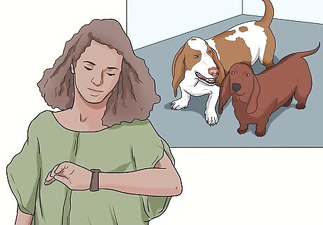 Give the dogs about 20 minutes to interact. Allow the two dogs to interact through the bars of the crate for up to 20 minutes. Remove the established dog from the room. Let the new dog out of the crate and take him to his toilet area.