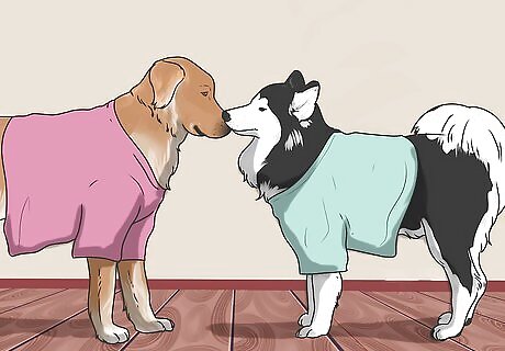 Exchange the t-shirts. Give the established dog the shirt the new dog slept on, and vice versa. This way the two dogs become familiar with each other prior to meeting. Since dogs communicate by scent, it is helpful to have them recognize each other's scents and associate it with your scent.