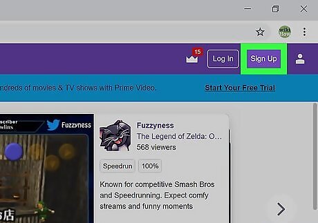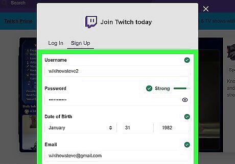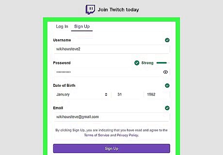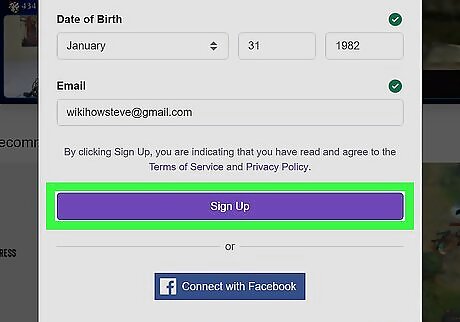 Sign up for an account with your email. You will need to create a username and password, and enter your date of birth to sign up. You can also use your Facebook account to sign up for Twitch.