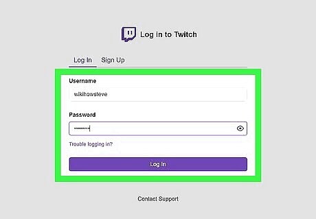 Create an account by clicking Sign Up on the right. Create a username and password. You will also need to provide an email. You can also use your Facebook account to sign up for Twitch. If you already have a Twitch account skip to the last step.
