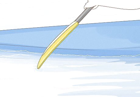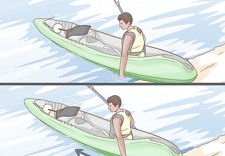 Push yourself out into the water using your paddle and body weight. When you’re ready to embark on the water, grab the paddle and raise it vertically on your side. Dig the blade into the shore and scoot your weight forward repeatedly to push off into the water. If you’re with any other people, ask someone to just push you into the water. This is a lot easier than scooting yourself in. If you’re embarking from a dock, either wait for the tie rope to be untied by the dockmaster or untie it from the boat yourself and leave it tied to the cleat on the dock.