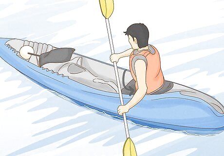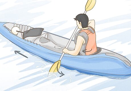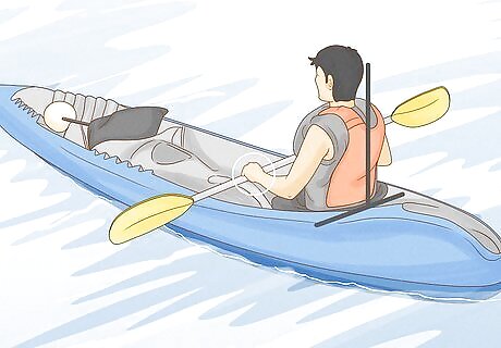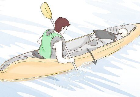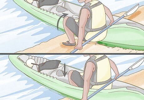 Find a rhythm as you paddle to continue going forward. As you paddle, you will feel how the kayak shifts slightly with each individual stroke. Find a pattern where that shifting is even on both sides to keep your kayak moving straight. Use an equal amount of strength with each stroke to move consistently and smoothly. Tip: If you fall out of the kayak at any point, stay calm. First, flip the kayak back over. Then, reach over the kayak grab the opposite side of the cockpit. Start kicking and get as close as you can to the horizontal surface of the water. Pull yourself up while kicking hard and reorient yourself in the seat.