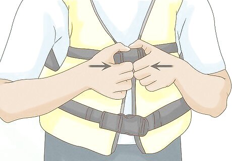 Put on a lifejacket and secure it before kayaking to stay safe. You should never go kayaking without a lifejacket. Either buy a lifejacket or get one from a rental company. Slide the lifejacket on over your head and clip the straps together on your chest. Pull the loose ends on the straps to tighten the lifejacket and fit it tight on your chest.Tip: As a rookie kayak enthusiast, go out kayaking with at least one other partner or an instructor. This way, you’ll have help nearby if you fall out or run into trouble. You should also wear a hard-shell helmet if you’re going white-water kayaking or kayaking in a river. It’s not a good idea to do this your first time out, though.
