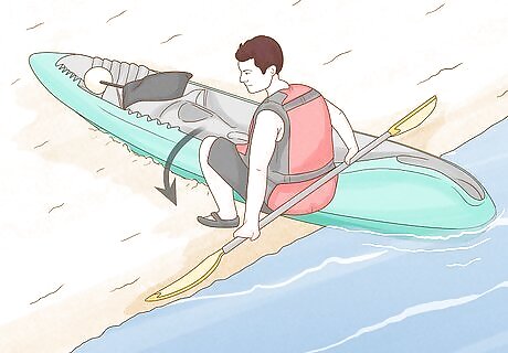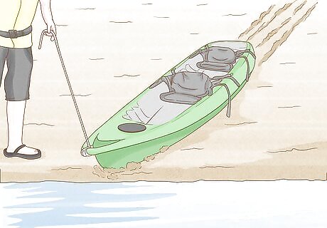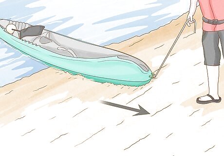 Secure the kayak with a tie line or by pulling it out with the strap. For a beach landing, grab the front of the kayak by the strap and slide it all the way on to the shore so that the water isn’t within 10 feet (3.0 m) of the boat. Otherwise, the kayak may get pulled out into the water. For a dock landing, use the rope on the dock to tie the boat to the cleat. If you’re taking the kayak out of the dock, grab the strap on the front of the kayak and pull it up on to the dock.