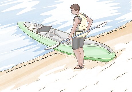 Let the kayak down so the cockpit rests over the edge of the water. Drag the kayak directly to the edge of the water. Hold the paddle behind you while you drag the kayak with your free hand. Continue dragging the kayak and let it down so that the cockpit is resting on the spot where the water meets the shore. If the paddle is in front of you and you drop it in the water, it may float away.
