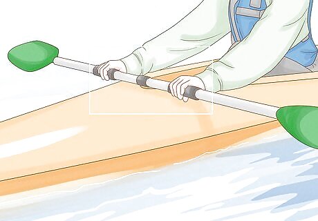 Hold the paddle vertically to use draw strokes to move sideways. If you’re trying to line up with the dock when you’re coming back or if you’re kayaking with other people and you’re close to bumping into someone, hold your paddle vertically with both hands. Then, stick one blade underwater with the flat side facing away from you. Slowly push the blade away from you to push yourself sideways without changing the angle of the boat. If it’s more comfortable, point the blade towards your kayak and pull it towards you on the opposite side to move the same direction.