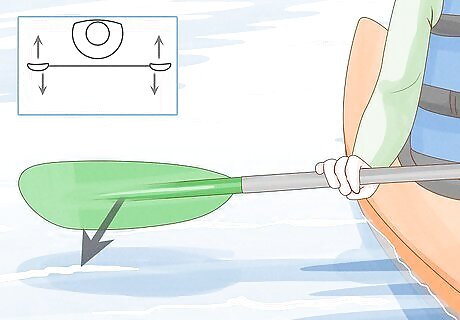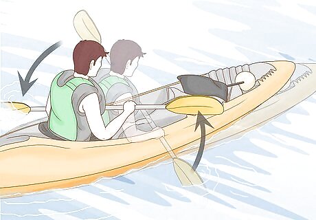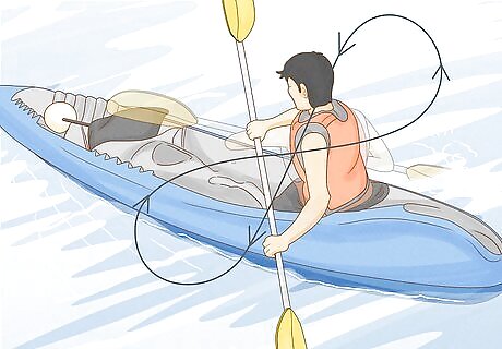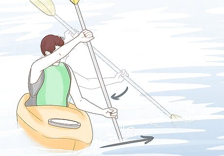 Use sweep strokes to pivot the angle of the kayak and turn. To turn left, extend the right side of your paddle out in front of you and lower it into the water. Twist your torso to the left and drag the paddle backwards in a semi-circular motion while uncoiling your upper body. Repeat this stroke if you need to keep turning and reverse the direction to go to the right.Tip: You can repeatedly paddle like you normally do on one side of the kayak to turn, but this is kind of difficult to do correctly and it’s not particularly energy efficient. It’s much easier to use one or two sweeping strokes to change the angle of the boat and continue paddling forward. Your chest turns in the opposite direction that you’re moving the paddle to compensate for the shift in your center of gravity. Maintain your center of balance while doing this. It can be kind of tempting to lean towards the paddle while you do this, but you may fall into the water if you lean too far.