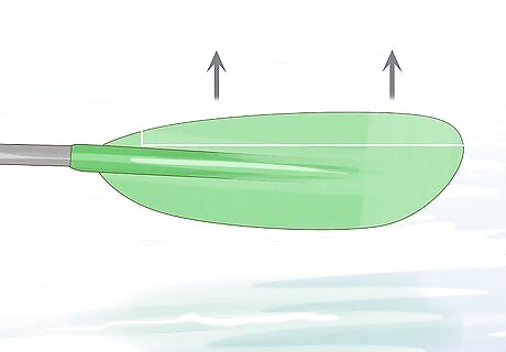 Angle the paddle while bringing the raised blade forward. As you start the stroke, tilt the blade you pulled back down 15- to 25-degrees. Push the raised blade forward while lowering it towards the water. Do this in a kind of semi-circle so that the raised blade goes up and lowers down almost perpendicular to the water. If it helps, imagine that you’re turning two gears with each arm moving in opposite directions. The arm moving forward turns at the same time as your other arm lowers back behind you.