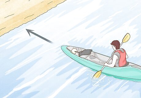 Use forward strokes to paddle on the shore for a beach landing. If you’re landing on the beach or shore, paddle forward. Find a calm part of the shore with an even, flat surface to land and angle the kayak towards that. Continue paddling forward until the front of your kayak slides forward on to the ground.