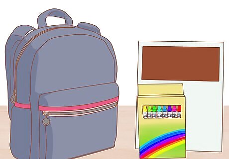 Create a goody bag for your toddler to open on the plane. Fill a bag with a variety of toys, games, crayons, stickers, snacks, and other items that your toddler will enjoy. Then, give your toddler the bag on the plane and let them unpack it! They will have fun taking all of the new items out of the bag and they can choose what they like to keep them occupied. Some items you could place in the bag include: A coloring book and crayons A board book Stickers A few of their favorite snacks A small plush toy Toy cars A plastic container with a hole cut in the lid and pom poms to stuff into the holeTip: Get items that you don’t mind losing if they fall under the seat on the plane. Visit a dollar store and grab several items that you think your toddler will enjoy.