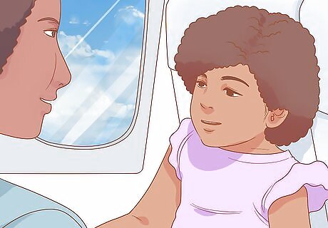 Request a window seat and let your toddler sit next to it. Before, during, and after takeoff, your toddler may love looking at the views outside of the plane! If possible, request a window seat and let your toddler sit in it. Direct their attention to the window when they are readying the plane for takeoff, show them the ground whizzing by as the plane speeds up, and then let them enjoy the view as the plane glides over the clouds. If you are bringing your toddler’s car seat on board, this will give them an even better view out the window.Tip: If your toddler takes a nap at the same time each day, it might be a good idea to schedule the flight at the same time as your child’s naptime.