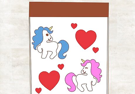 Draw scenes and have your toddler decorate them with stickers. Bring a tablet of construction paper and some markers. Then, ask your toddler what they want you to draw. You can offer them several options, such as a house, a race track, a tree, or a boat. Then, give your toddler the finished drawing and let them decorate it with stickers. Try getting some stickers that will match up with different scenes, such as animal, flower, and weather stickers.