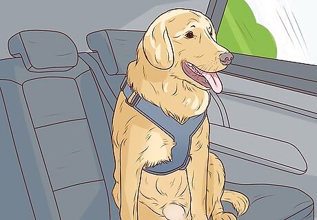 Travel safely with dogs in your vehicle. Any time you drive somewhere, you should always buckle up your seatbelt. The same is true of your dog. If your dog is freely roaming the vehicle and you make a sudden stop or are involved in a collision, your dog can seriously injure its back and neck. By taking precautions any time your dog travels with you, you can significantly reduce the risk of injury. Make sure your dog is used to traveling in a vehicle before you attempt any long drives with your pet. A stressed dog may wiggle, jump, and try to move around the vehicle. Use a travel harness to keep your dog securely fastened in place during car trips. You can purchase a travel harness at many pet stores or through an online retailer. Consider a skybox or booster seat, which is used in conjunction with a harness to keep your dog fastened in a cushioned box. If you have a vehicle with a hatchback or "boot," you may want to consider using a car grid. This metal grate fits over the backseat's headrest, keeping your dog confined to the trunk area during car trips.