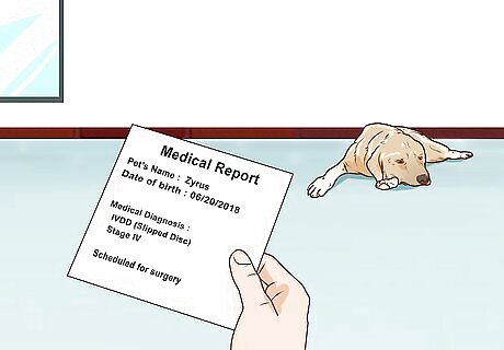Make an appointment with your vet. Whether your dog is of a breed prone to IVDD or has sustained a spinal injury, your vet will need to see your dog right away. A vet can help rule out other problems, diagnose the problem with your dog, and recommend a treatment plan. Your vet will need to perform a full neurological exam, as X-rays alone are usually insufficient at identifying a slipped disc. Some tests your vet may run include an X-ray with dye contrast, a computed tomography (CT) scan, magnetic resonance imaging (MRI), or some combination of these tests. Your vet may also draw a small sample of cerebral spinal fluid to rule out a spinal infection.