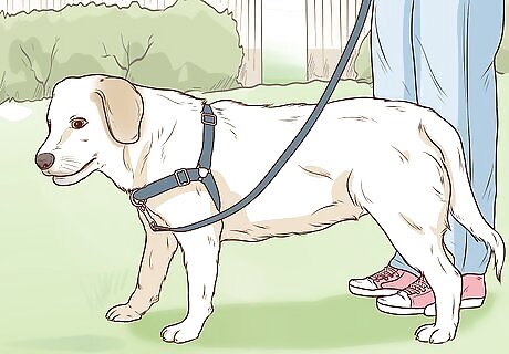 Use a harness instead of a collar. You should always use a leash to walk your dog. However, instead of clipping that leash to your dog's color, consider using a chest harness. These devices slip easily onto your dog's torso, and you can attach any standard leash to a harness. When you pull on the leash, a harness will distribute that pressure across the dog's body. With a collar leash, your dog's neck and upper back receive most of the force. You can purchase dog harnesses at most pet stores or through an online retailer.