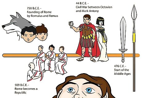 Learn the basic timeline of Ancient Rome. One of the first steps you should take is to learn about the timeline of Ancient Rome. Learning about Rome’s timeline will help you understand the many events, figures, and periods that are essential in understanding Ancient Rome. Consider a few major events: According to legend, Rome was founded in 753 B.C.E. by Romulus and Remus. In this era, the Kingdom of Rome grew large and powerful. Rome transitioned to a republic in 509 B.C.E. The people of Rome had decided that their survival was consistently threatened by Roman rulers trying to exercise absolute power. This era introduced a constitution, magistrate and senate. This system was designed to balance the power of government. In the centuries after this, Rome won a very costly and lengthy series of wars against invading Gaul and Carthage. After the assassination of Julius Caesar in 44 B.C.E. and a civil war between his heirs Octavian and Mark Antony, Octavian proclaimed himself Emperor and the Republic became an Empire. A period of 200 years of peace and stability, known as the “Pax Romana,” followed. Rome slowly began to decline. In the 2nd and 3rd centuries C.E., the empire split into east and west. The west which included Rome itself, further divided and collapsed. The eventual sacking of Rome by invaders in 476 C.E. signaled the start of the Middle Ages in Europe. The Eastern empire continued much longer, ruled from Constantinople, until it was eventually annexed by the Ottoman Empire.