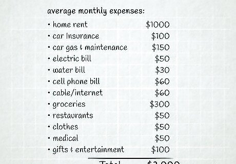 Calculate your average expenses for a month. Your expenses include everything that you spend money on. These include fixed expenses, which are the same every month, like your rent or mortgage, car payment, insurance, and utilities, as well as expenses that vary monthly, like your groceries and entertainment money. To get a good idea of what you're spending, read over your bank and credit card statements for the past several months. If you don't have these available or you mostly use cash for your purchases, try writing down everything you spend for about a month, then use that to build your budget.