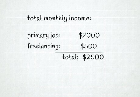 Figure out your total income for a month. Before you can decide how to divide up your budget, you'll have to know exactly how much money you'll have available. Add up your income from any different sources, including your primary job, and side hustles, financial aid from school, or monetary help you get from your family or others. Since most bills are due once a month, it's usually easiest to plan a monthly budget, regardless of how often you get paid. However, if you'd prefer, you can make your budget for any time frame—like a weekly or annual budget. It's okay to estimate how much you'll earn, especially if you don't get regular paychecks—like if you're a gig or seasonal worker. If you expect to earn about the same as you did last year, look at your last tax return to see what your income was for that year. Then, divide that amount by 12 to estimate your monthly income.
