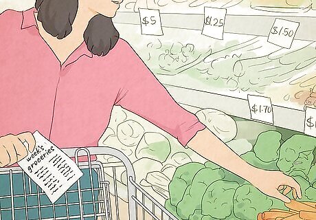 Plan out your meals a week at a time. It's almost always more cost-efficient to cook at home, especially if you plan out your menu in advance. Each week, look at the grocery ads in your local paper or online to find what's on sale. Then, plan out the meals that you and your family will eat for the entire week. If you stick to your list, it should help you avoid overspending when you shop. Try to use the same ingredients in more than one meal. For instance, if you buy a roast and a large bag of potatoes, you could have the roast with mashed potatoes and gravy for dinner one night. Then, you could serve the leftover roast on sandwiches the next day for lunch and use the rest of the potatoes for fries with dinner another night. Proteins and veggies can be expensive. Stretch them further by including inexpensive, filling foods like oatmeal, whole grain pasta, potatoes, brown rice, and beans with each meal. It's often cheaper to buy groceries in bulk, but not always—calculate the price per item (or price by volume) to see if the larger option is actually more cost-effective. Also, only buy something in bulk if you're sure you'll use it all before it expires.