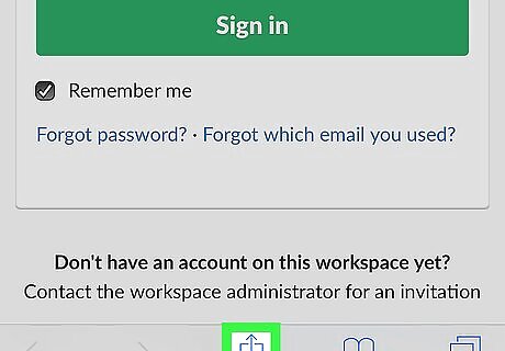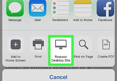 Tap Request Desktop Site. It’s in the bottom row of icons on the sharing screen. You may have to swipe to the left to find it. This will refresh the page to the version you’d see if you were logged in on your computer. If you’re using a smaller-screened iPhone, you may have to zoom in or use landscape mode to see the links and buttons in Slack.