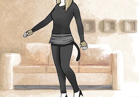 Dress in a cat outfit. Depending on the type of cat you are trying to look like, you can choose from a variety of outfits to get a cat-like look. A tight fitting, black body suit and knee high black boots will help you look like catwoman. Wearing leopard or cheetah prints with leather moccasins will give an animalistic look and add to the cat-like ambiance of the rest of your costume. Wear neutral tone colors with fur trim and fur lined boots to provide a general cat-like look