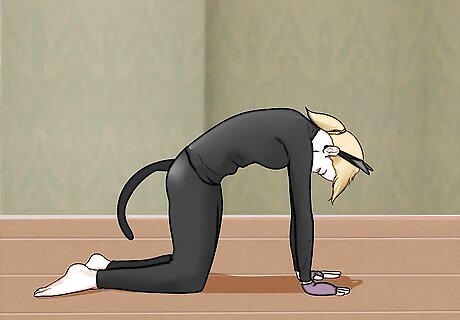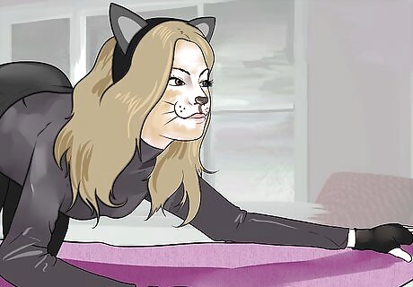 Arch your back. Cats arch their backs many times throughout the day for a variety of different reasons. Walk with your shoulders held high and a slight bend in your upper back to create this effect. Use your arms to mimic the front legs of a cat and hold your elbows close to your body brining your hands to your face as if you were a cat grooming herself. Get down on all fours and scoop in your abdomen to raise your back up. Cats arch when they are stretching after a long nap. Cats also arch when they are frightened. This is sometimes combined with a hiss.