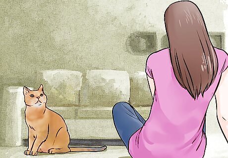 Play with cat toys. Cats are very playful animals. Two ways they like to play are batting at feathers or toys and pouncing on small rodent looking toys. Mimic this playful behavior with stuffed animals or balls in your house.