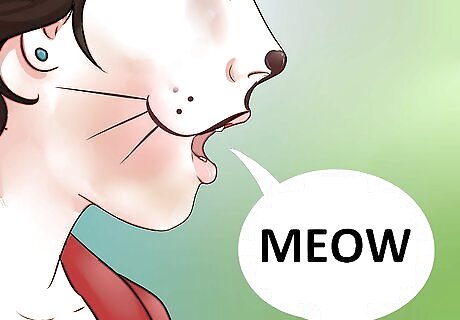 Meow, purr, and hiss. You can look like a cat by sounding like a cat. By understanding why cats make certain noises, you can start to sound like a cat. Cats meow when they are greeting someone, commanding something, objecting to something, or announcing something. When a cat purrs, it means that they are happy and content. A cat will hiss when it is annoyed, frightened, angry, or aggressive.