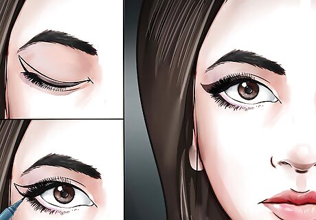 Apply cat eye eyeliner. Use black eyeliner to create a cat eye look on your eyelids. Line your eyelid with the eyeliner, and then add a small curved line extending beyond the outside corner of your eye. Draw a line on your eyelid starting from the inner corner of your eye and extending to the outer corner. Create a wing by drawing a small, slightly curved line extending out from the outer corner of your eye. Draw a line to connect the tip of the wing to the line on your eyelid. Color in the space between the two lines