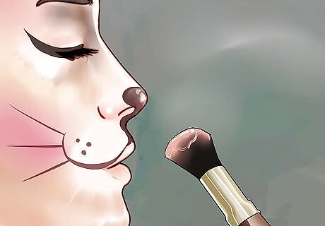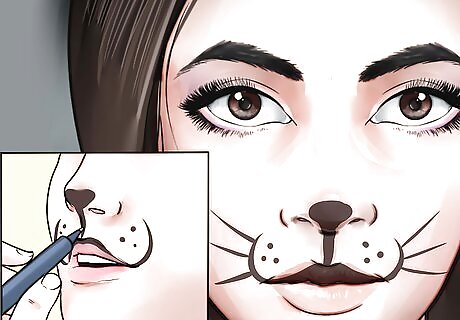 Create a cat nose. Use the black eyeliner to draw a triangle on the tip of your nose. One corner of the triangle should be pointing down and the other two should point to the sides. Color in the triangle. Add whiskers by drawing straight lines on your cheeks starting at the edge of your nose and extending out onto your cheek. Draw 3 to 5 whiskers on each side of your nose. A face paint pencil can also be used in place of eye liner.
