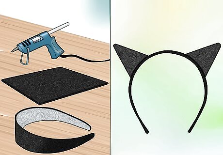Accessorize with cat ears. To look like a cat, you need to wear cat ears. You can get cat ear headbands or hair clips online or from costume stores, or you can make your own cat ears. Gather a black headband, black foam, a hot glue gun, a pen, and scissors together Draw two diamonds on the foam. Make the diamonds 2 inches wide and 4 1/2 inches tall. Cut the two shapes out of the foam. Glue the center of the diamond shapes on the underside of the headband. They should be spaced a bit apart and glued where you want the ears to be. The short edge of the diamond will be attached to the headband with the long edges sticking out. Fold the long sections of the diamond up and glue the front to the back triangular piece on each ear.