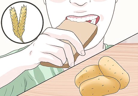 Make your grain choices 100% whole grain. During weight loss, cutting back slightly on your grain intake can make weight loss go a little faster and make it a little easier; however, when you're choosing to eat a grain, go for 100% whole grain items. Studies have shown that when you limit carbohydrates, especially from carb-rich foods like grains, you lose weight a little more quickly compared to other types of diets (like low calorie only or low fat only). Grains are very high in carbs so moderate how much of these you eat when you're trying to lose weight. Include a serving daily if you'd like. Measure it out so you keep your intake to a minimum. Serving sizes depend on the type of grain, so make sure you read the packaging on your foods. For instance,1 slice of bread is usually 1 serving, and 1 cup of cooked long grain brown rice is equivalent to 2 servings. Also, choose 100% whole grains since these are less processed and higher in fiber. Go for brown rice, quinoa, whole wheat bread, whole wheat pasta or whole wheat English muffins.