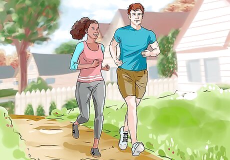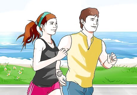 Find ways to stay active together. In addition to diet, including regular exercise will help support your weight loss and weight maintenance. Staying active with your partner makes exercise a little more easy to do. Studies have shown there are many benefits to working out with your partner. First off, you're more likely to stick to your workout routine if you know someone else is counting on you. In addition, bringing your partner along may help you workout a little harder and a little longer as well. Both of you should aim for 150 minutes of cardio exercises each week in addition to 2 to 3 days of strength training. Find days and times when you can go together and do an activity together.